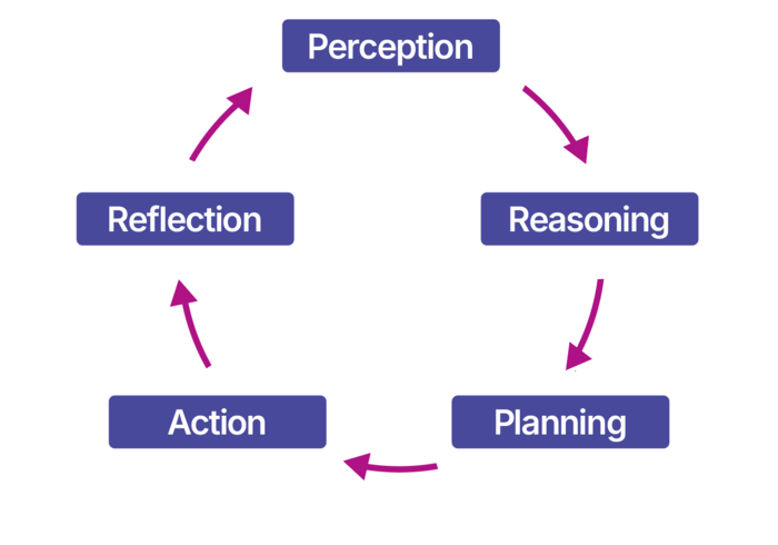 Agentic workflows start with the “perception” phase. Here, an agent is triggered by information from sensors, database changes, or another stimulus, like a human command. Next comes “reasoning” performed by Large Reasoning Models (LRMs). LRMs are a new kind of LLM specifically trained for “thinking”. While reasoning, these models build plans for how to achieve their goals. The agent then acts, rather than suggesting a process to a human. Finally, agents review outcomes to improve future results.