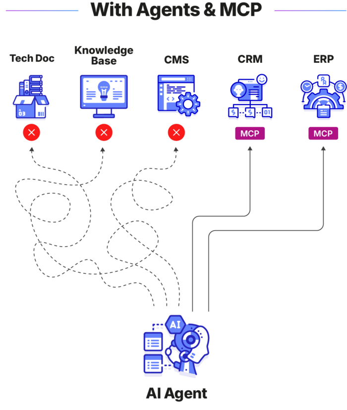 The challenge lies with informally organized content residing in files and various repositories. From shared drives to Enterprise Content Management (ECM) systems, wikis, and CCMSs, many sources lack MCP enablement, making the information inaccessible to agentic systems. Therefore, when companies build agentic systems, entire groups of knowledge are left out as LLMs/LRMs will ignore non-MCP-enabled applications and their content. This creates blind spots for AI, leading agents to introduce errors and incomplete information into workflows.