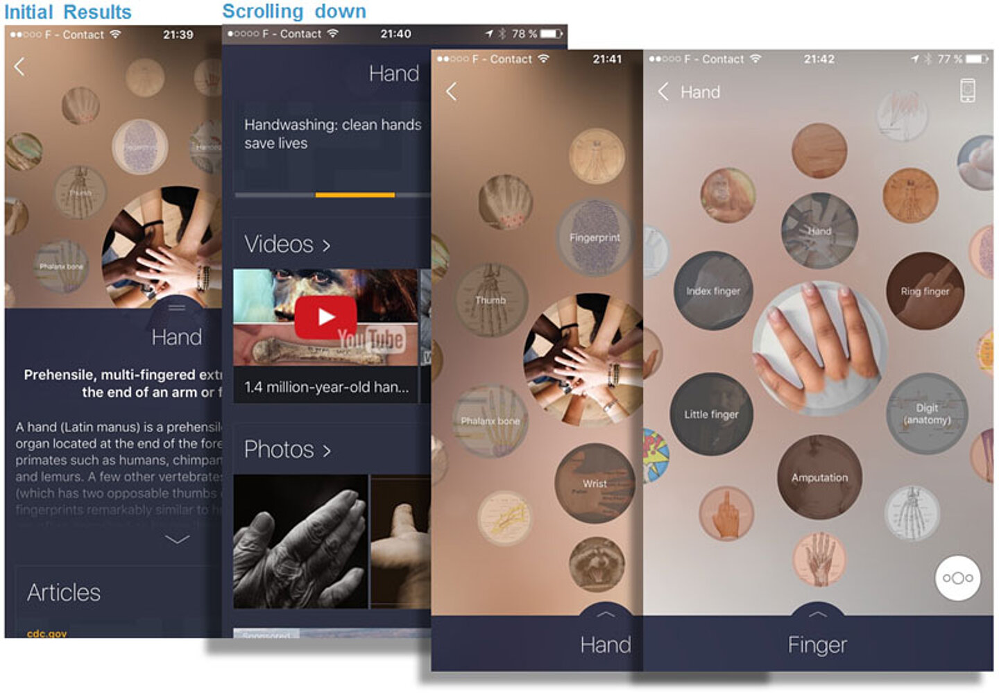But it doesn’t stop there. Behind these results is an extensive ontology represented by spheres, which provide new results. Tap the "finger" sphere to get a new ontology in which, interestingly, one of the links leads to "amputation".