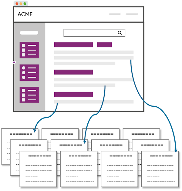 Even when using a component-based authoring strategy, documentation is still primarily imagined as a series of stories organized in documents, reference guides, and manuals. The challenge here is a transition from a document rendered as a continuous flow of sentences and paragraphs to a set of discrete web pages.
