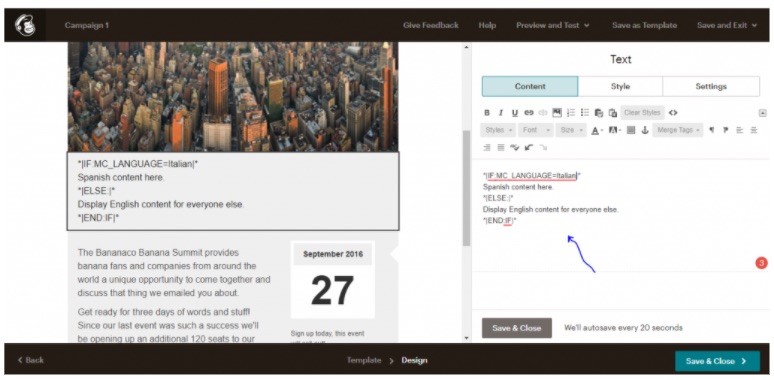 Figure 2: Mailchimp campaign with multiple languages crammed into one HTML file via merge tags